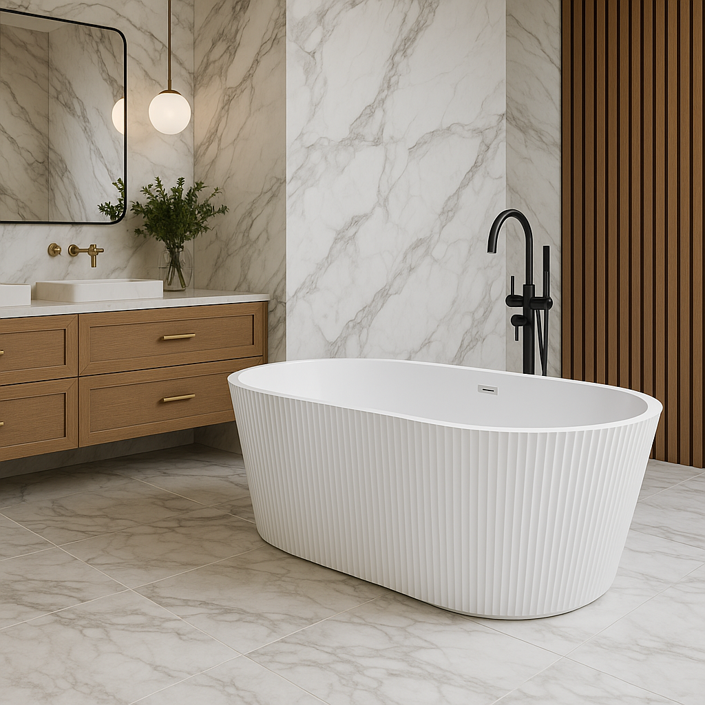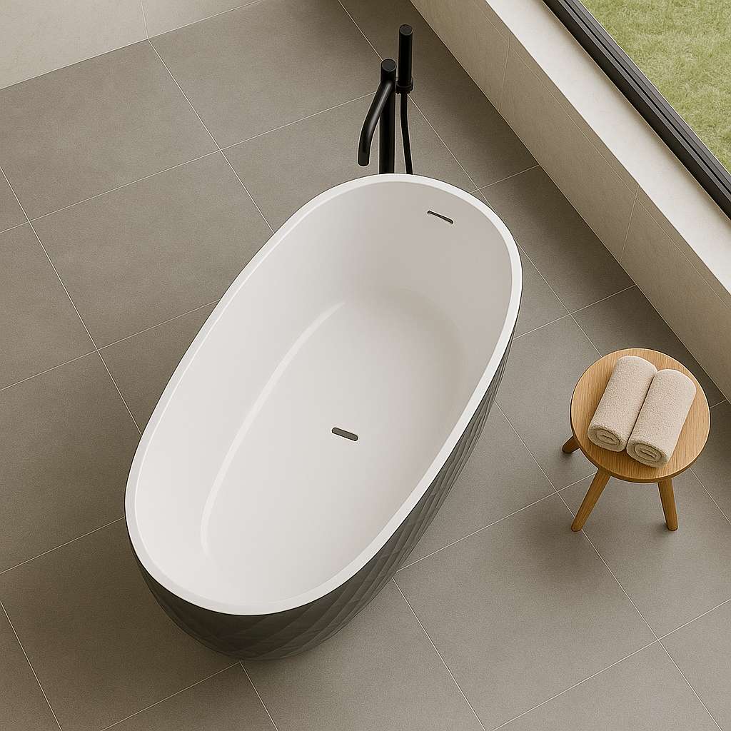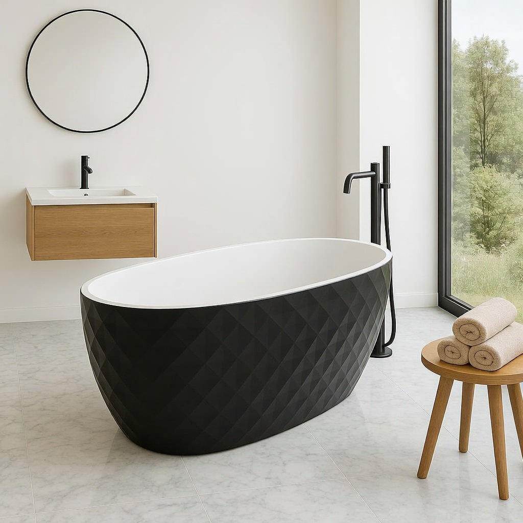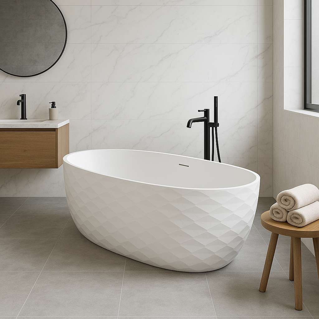 Experience pure elegance with the Giana Gloss Grey Freestanding Bath, a bold centerpiece designed for statement bathrooms. The distinctive diamond-textured exterior in deep gloss White contrasts beautifully with the smooth white interior, creating a visual masterpiece of modern luxury. Crafted for comfort and style, its spacious oval design allows deep soaking and ultimate relaxation after a long day.