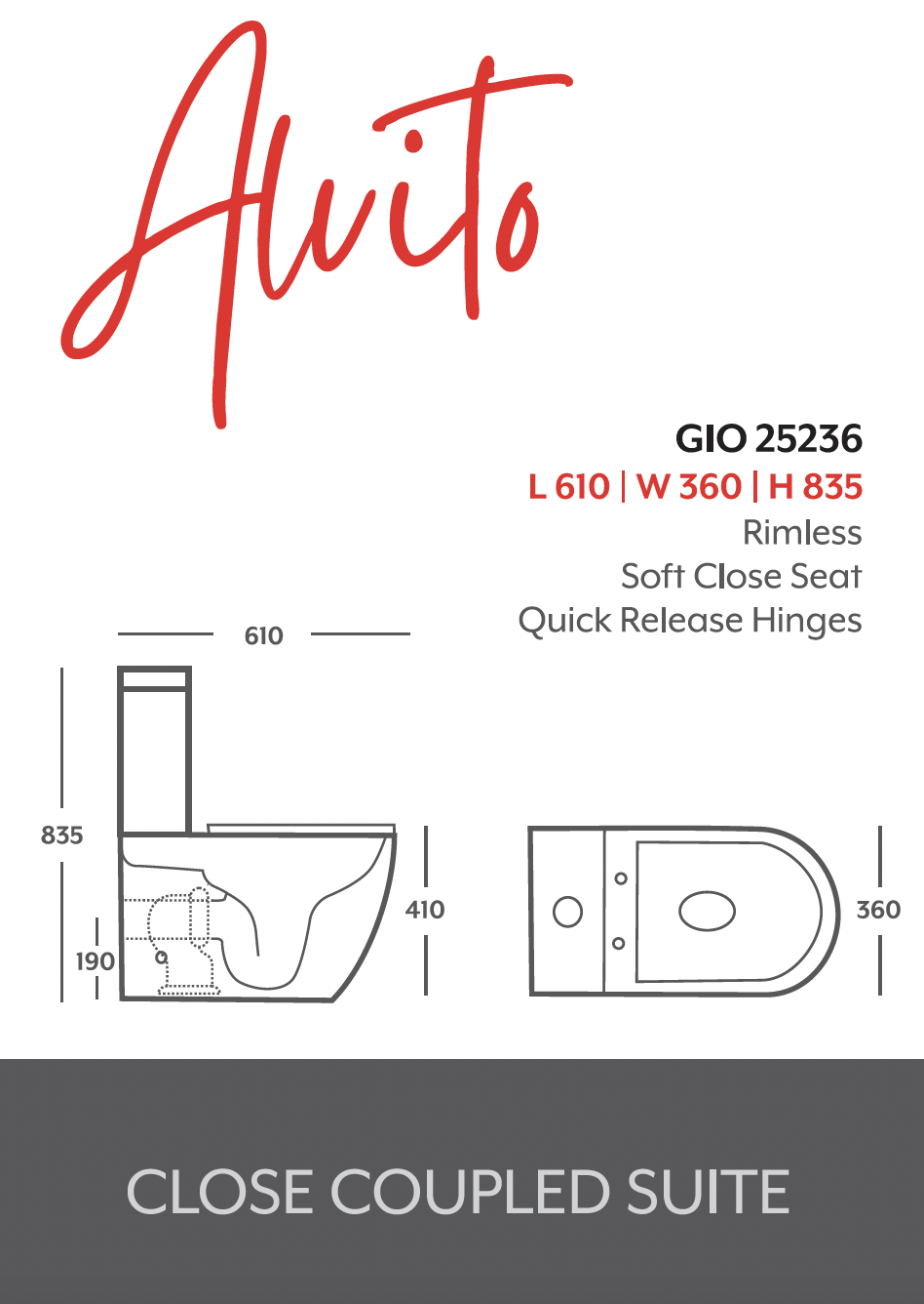 The suite includes a soft-close quick-release seat, which eliminates slamming and allows fast removal for deep cleaning. Made from premium vitreous ceramic with a durable high-gloss finish, the Gio Alvito offers long-lasting performance, elegant aesthetics and reliable day-to-day use.