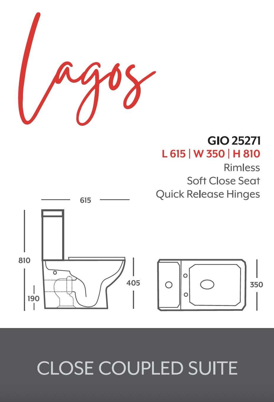 The Gio Lagos Rimless Close-Coupled Suite in Gloss White is a sleek, modern toilet designed with clean lines and a slightly angular profile that adds a refined touch to any contemporary bathroom. With a compact and comfortable size of L 615 × W 350 × H 810 mm, it fits neatly into en-suites, guest bathrooms and main bathrooms without compromising on style or performance.