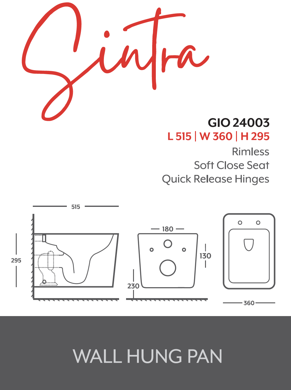 Made from durable vitreous ceramic, the Sintra features a rimless flushing system for improved hygiene and effortless maintenance. Its premium soft-close slim seat ensures quiet operation and everyday comfort, making it ideal for luxury residential and commercial spaces.