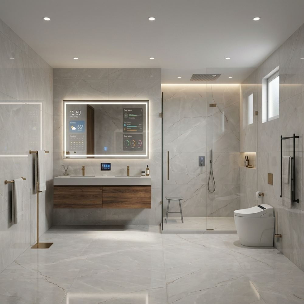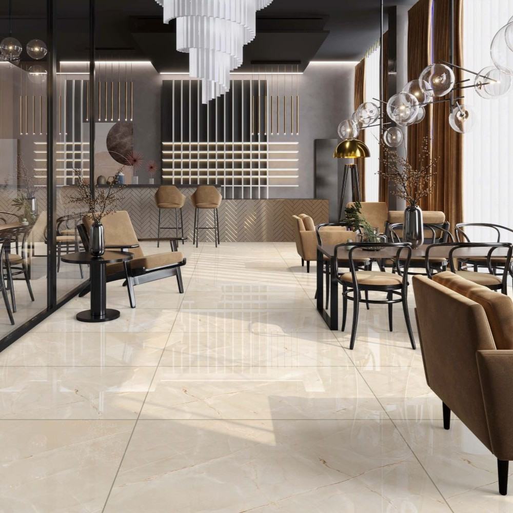 A premium marble-look porcelain tile with subtle gold veining and a polished finish, perfect for creating elegant, luxury interiors.