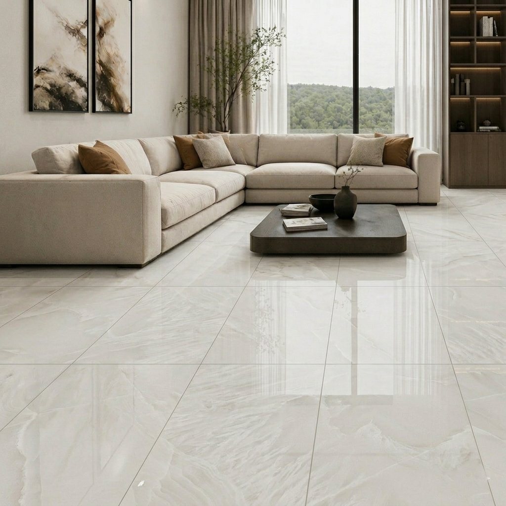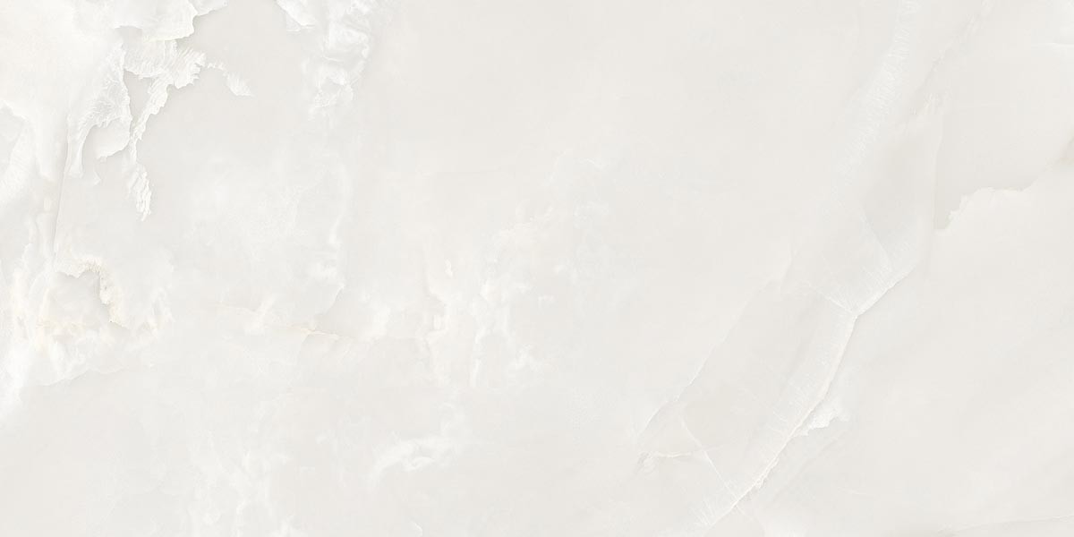 A premium white onyx-look porcelain tile with a polished finish, ideal for creating bright, elegant and luxurious interiors.