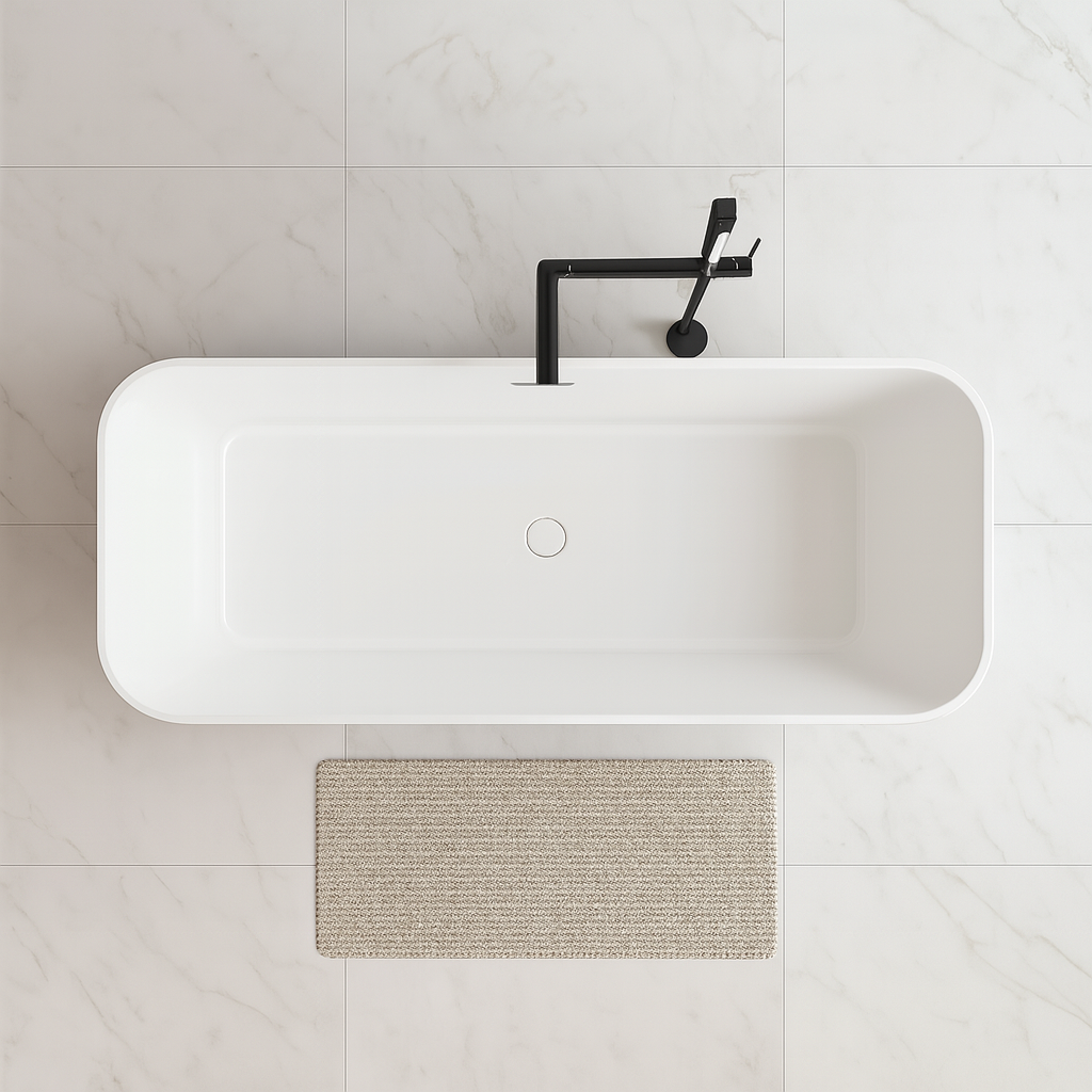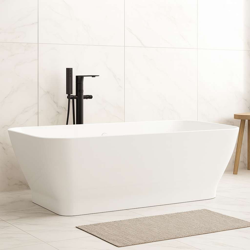 Experience contemporary luxury with the Quattro Freestanding Bath. Made from high-quality engineered stone, this bath combines strength with elegance, delivering both durability and timeless design. The sleek gloss white finish enhances its clean lines, while the compact 1600mm length is perfect for modern spaces. Its ergonomic shape provides deep comfort and relaxation, and the minimalist aesthetic allows it to seamlessly complement marble tiles, matte black fittings, or wood accents.